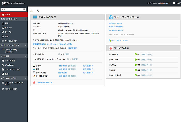 Pleskは一つのグラフィカルなGUIでサーバー及びドメインを一括して管理する事が出来る標準的な機能で十分な用途向けの日本語対応のサーバー/ドメイン管理パネルで複数のドメインをGUIで簡単に管理する事が出来ます。