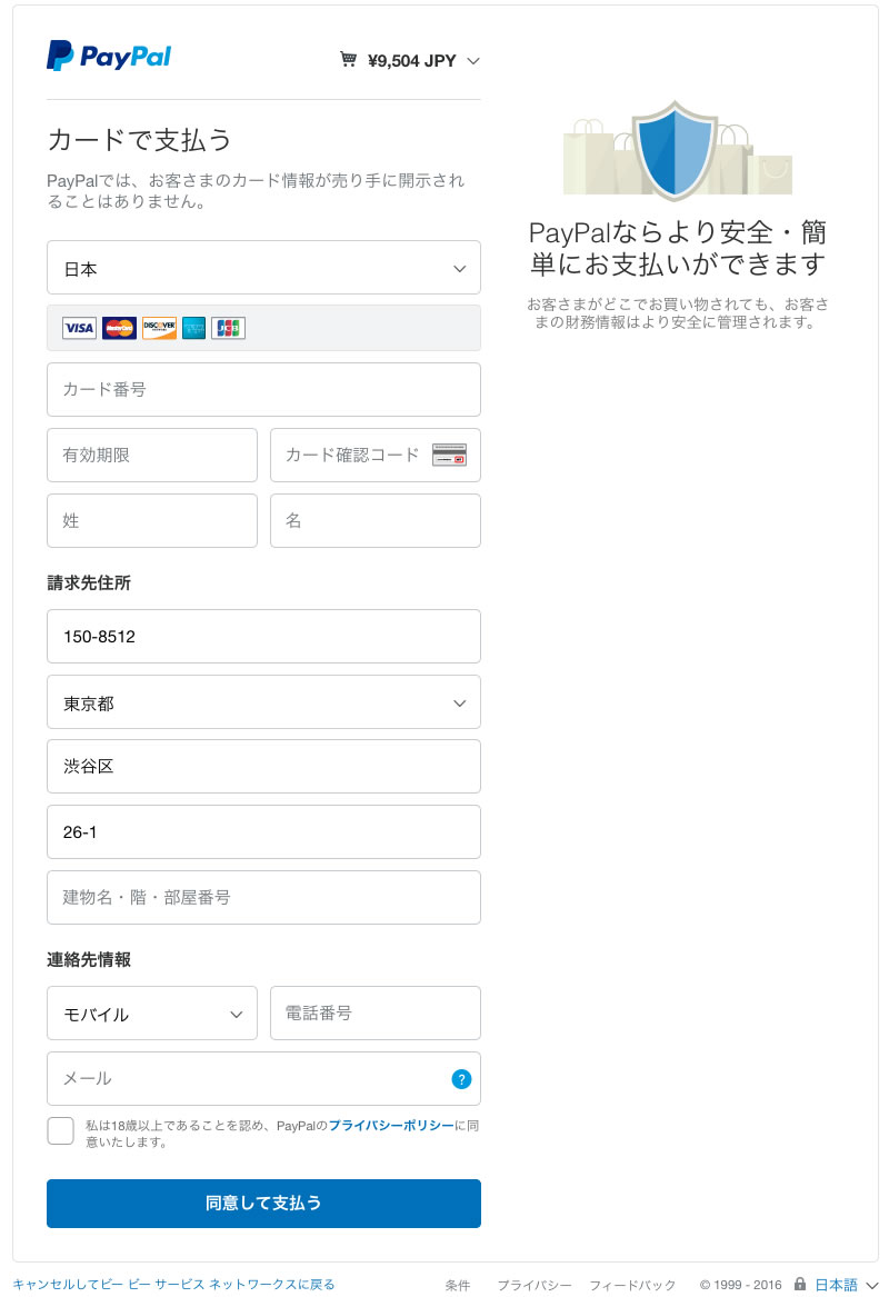 カードで支払うを選択した場合、クレジットカード情報の入力ページに移動致しますので、必要事項をご記入頂きプライバシーポリシーの同意にチェックして「同意して支払う」をクリックして下さい。