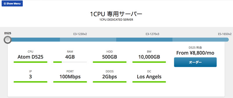 「Show Menu」 を選択頂くとプルダウンで各プランのお申し込みページに移動する事が出来ますので、スライドでご希望のプランを表示して 「オーダー」 をクリックして下さい