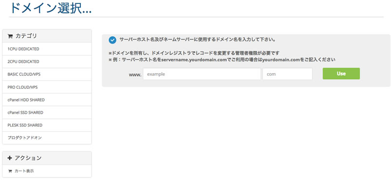 3. ドメイン選択ページに移動致しますので、サーバーホストに使用するドメイン名を入力し 「Use」 をクリックして下さい。