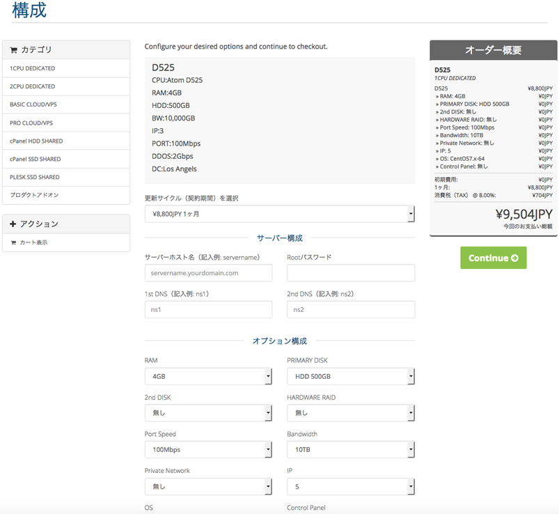 4. 構成ページに移動致しますので、お申し込み内容を確認しサーバー構成のご記入及びオプションを確認し 「Continue」 をクリックして下さい。