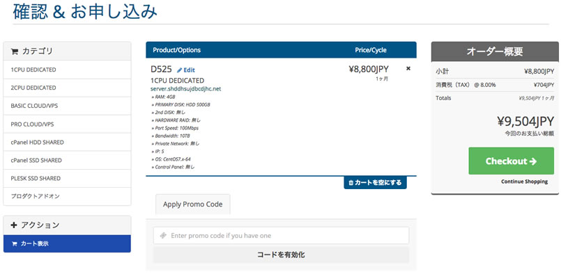 5. 確認&お申し込みページでお申し込み内容を確認し 「Checkout」 をクリックして下さい。