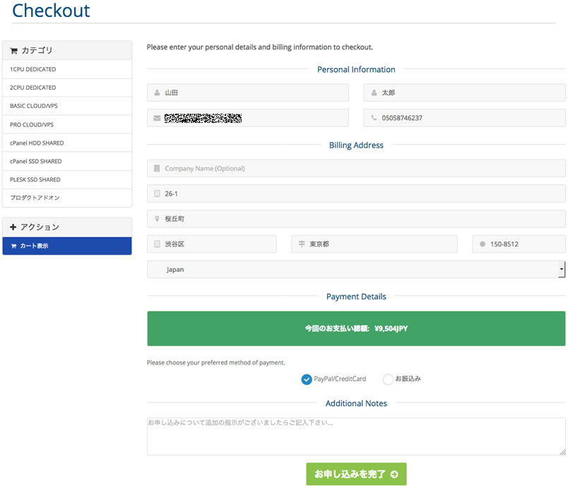 6. チェックアウトページに移動致しますので、お客様情報を確認しお支払い方法を選択して 「お申し込みを完了」 をクリックして下さい。