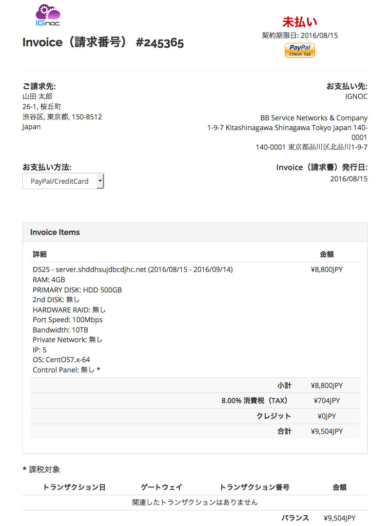 7. Invoice(ご請求書)が表示されますので、お申し込み内容間に違いが無いかご確認下さい。